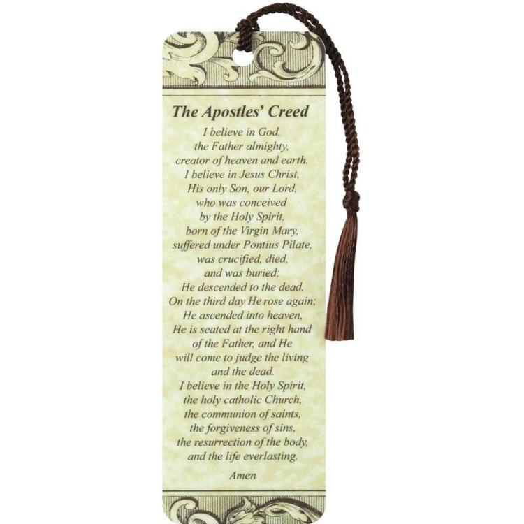 This bookmark features the apostles creed. On back side are To and From spaces for personalization. It is finished at top with a coordinating color tassel cord. Bookmark is card stock that is laminated for durability. Size is 2 x 6.