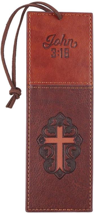 Brown Faux Leather Bookmark Two-Tone Cross – John 3:16 Bible Verse Inspirationa