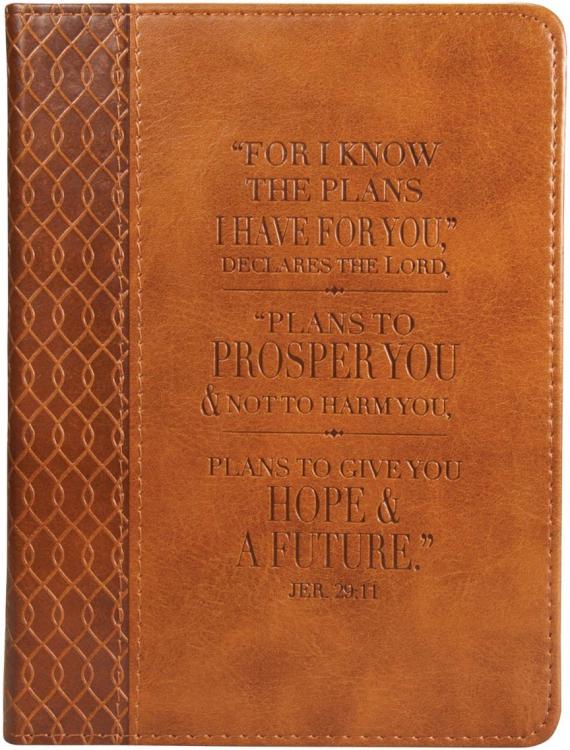 The I Know The Plans Tawny Brown Faux Leather Handy-sized Journal offers an encouraging message of hope paired with a robust design—the perfect encouragement for the man in your life.
