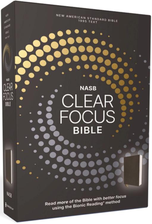 Finally, a resource to keep your mind from wandering while reading the Bible!Have you ever realized you’ve read a passage multiple times in a row and still can’t recall what it says? The NASB Clear Focus Bible uses Bionic Reading(R), which enables you to read more and with greater comprehension. Developed by Swiss scientists, Bionic Reading bolds the portion of each word most critical for comprehension and guides the eye from word to word over the text. This allows the brain to stay engaged, identify previously learned words, and absorb information without losing focus.In a world dominated by shallow forms of reading, the NASB Clear Focus Bible is the first-ever Bible available with Bionic Reading and encourages more in-depth understanding of written content. Imagine a quiet time where you read longer, read with more clarity, and give Scripture the undivided attention it deserves.Features:Full text of the New American Standard Bible, 1995 TextApplication of the award-winning Bionic Reading text method, enabling you to read more and with greater comprehension in a hectic and noisy worldReading plansTwo ribbon markersLeathersoft cover lies flat when openType size: 7.8