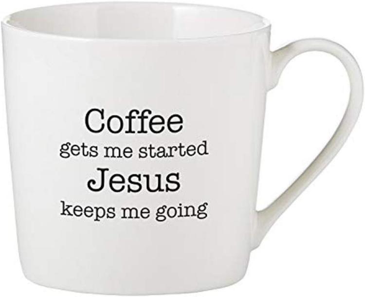 Signature style cafe mug featuring the phrase: Coffee Gets Me Started