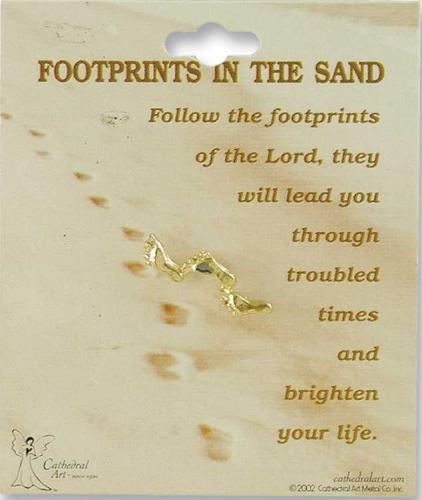 Goldtone lapel pin with finely detailed footprints, a heartfelt reminder that God will carry us when we can not manage the next steps ahead. Approximately 1″ x .25″; post back pin; carded; affordable gift for ministries and a thoughful gift of encouragement.