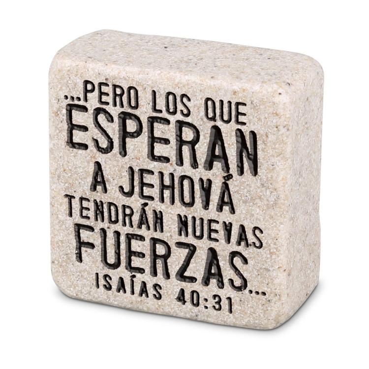 El adorno de estante de piedra guarda un mensaje poderoso en un espacio peque o. 2.5″ x 2.5″ en piedra moldeada, textura y acabado natural. “…Pero los que esperan a Jehov tendr n nuevas fuerzas… Isa as 40:31.”