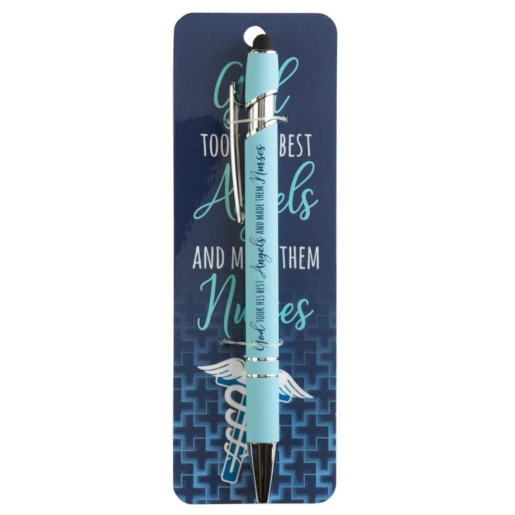 This Giftable Blue Pen Comes On A Bookmark Sized Card. The 2×6 Bookmark, Topped With A Coordinating Tassel Cord, Features A Fading Navy Cross-Patterned Background With A Cross-Backed Caduceus And Text. To And From Spaces On Back, Along With Ephesians 2:10. Text Is On Front Of Backer-Card As Well As The Pen Itself: God Took His Best Angels And Made Them Nurses. Scripture: For We Are Gods Handiwork, Created In Christ Jesus To Do Good Works, Which God Prepared In Advance For Us To Do.
