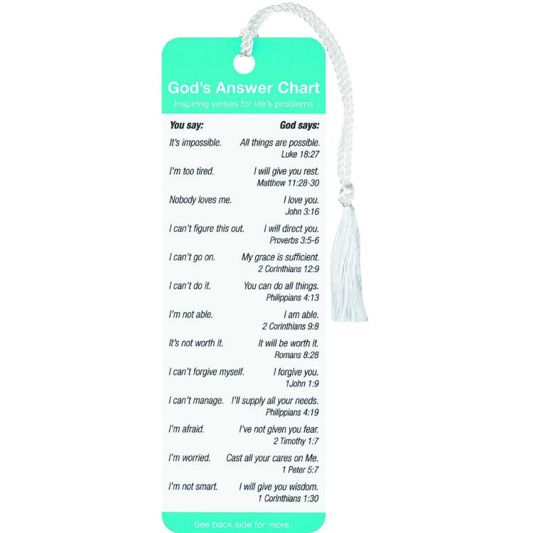 If you struggle with negative thinking, especially about yourself, keep this handy bookmark in your Bible. It is filled front and back with common misunderstandings people have about themselves, and then shows Gods answer to each statement and the reference for a supporting Bible passage. An example: You say: Nobody loves me. God says: I love you. John 3:16. Of sturdy laminated paperboard, bookmark is 2 x 6 and has coordinating tassel cord. Sold in packs of 12 bookmarks.