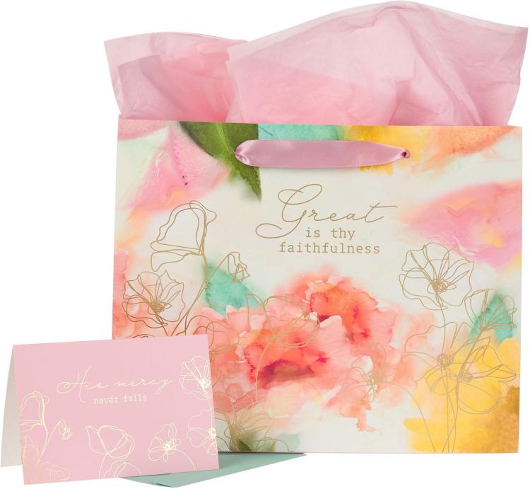 Celebrate God’s goodness in the life of a friend when you wrap your gift in the encouraging Faithfulness Pastel Meadow Large Landscape Gift Bag with Card a beautiful gift bag with an even lovelier message.