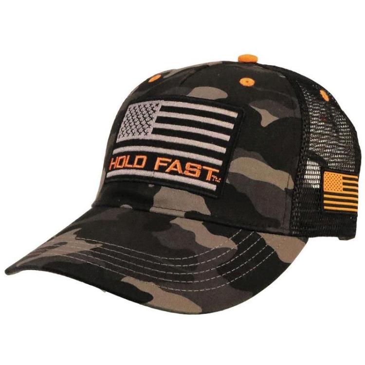 Proclaim your love of country in this HOLD FAST Black & Grey Camo Flag Cap. Hold fast to your faith, your family, and your freedom. We can celebrate these things because of the sacrifice of those who serve in the United States Armed Forces, and ultimately because of the sacrifice of our Lord and Savior, Jesus Christ, on the cross at Calvary. When you pledge allegiance to the flag, or see those colors flying in the breeze, think on these things. Inspire your family, friends, and neighbors to look to you as an example of faith in our nation, and in the Lord.