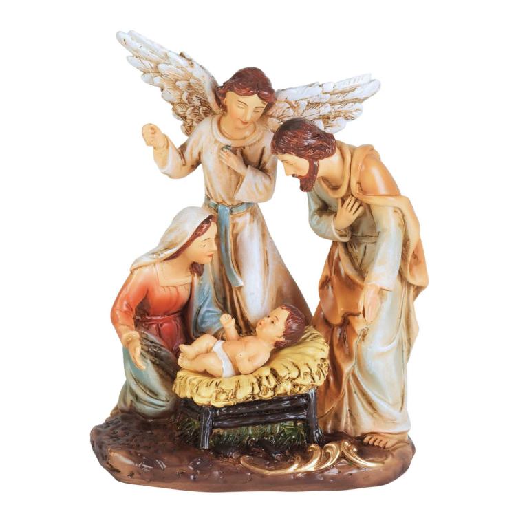 A Lovely Christmas Decor Piece, This 1-Piece Nativity Figurine Features An Angel Watching Over The Holy Family; Colorful Finish. Size Is 5 1/2in High. Made Of Resin.