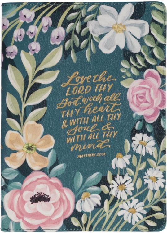The Love the Lord Teal Floral Faux Leather Journal with Zipper Closure blends a beautiful, colorful floral design with the reminder to love God with all you have and are.
