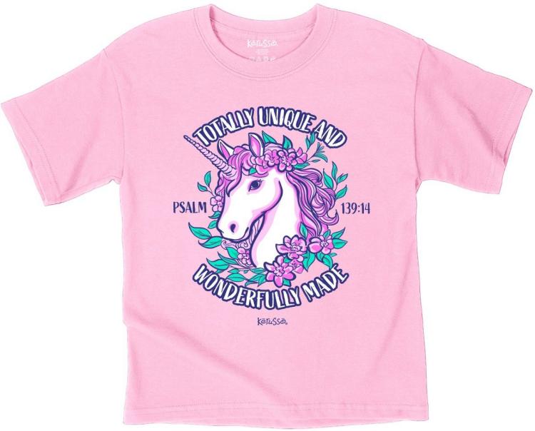Let her sparkle with purpose in this adorable Unique Unicorn Kerusso Kidz T-shirt in Classic Pink. Every little girl is wonderfully made by a loving God, and this bright, fun tee reminds her of that truth with every wear.