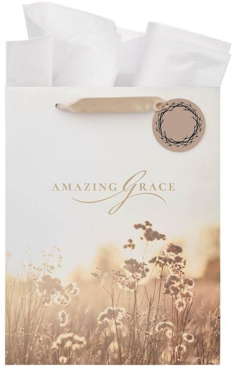 The Amazing Grace Wildflower and Crown of Thorns Large Portrait Gift Bag. is part of the Amazing Grace Taupe Crown of Thorns Collection, which includes coordinating pieces such as a paper bookmark with a tassel, a checkbook wallet, faux leather bookmark, faux leather Bible cover, faux leather journal, devotional, ceramic coffee mug, magnet set, spiral notebook, stainless steel water bottle and gift bag all designed in warm tones with Scripture-centered reminders of God’s love and sacrifice.