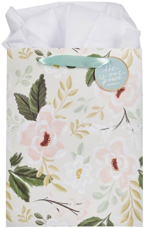The He is Our Peace Green Floral Large Portrait Gift Bag is large enough to hold a Bible, devotional, or chunky sweater.