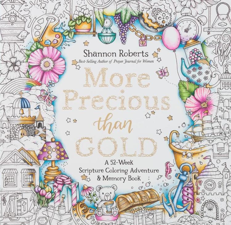 Embark on a whimsical coloring journey through warm beaches~ cheerful candy shops~ enchanting underwater reefs~ and more while you memorize God’s precious Word in More Precious than Gold: A 52-Week Scripture Coloring Adventure and Memory Book.