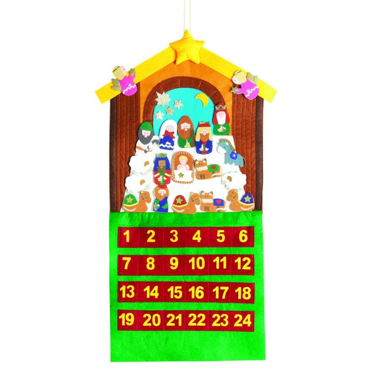 Children will delight in this fun advent calendar! Start with each of the 24 figurines in a pocket. Every day, take out the figure in that day’s pocket and add to the scene at the top. (Figures have Velcro attached.) When the scene is complete, it’s Christmas Eve! Or younger children may enjoy setting up all the figures right away and then re-arranging them as they desire. Small candy canes (not included) could be placed in each pocket with one removed each day, or just move a single one to the corresponding day’s pocket. Whatever tradition you choose, it’ll make great memories for the whole family. Overall height is 29″”. Hanging loop in back.