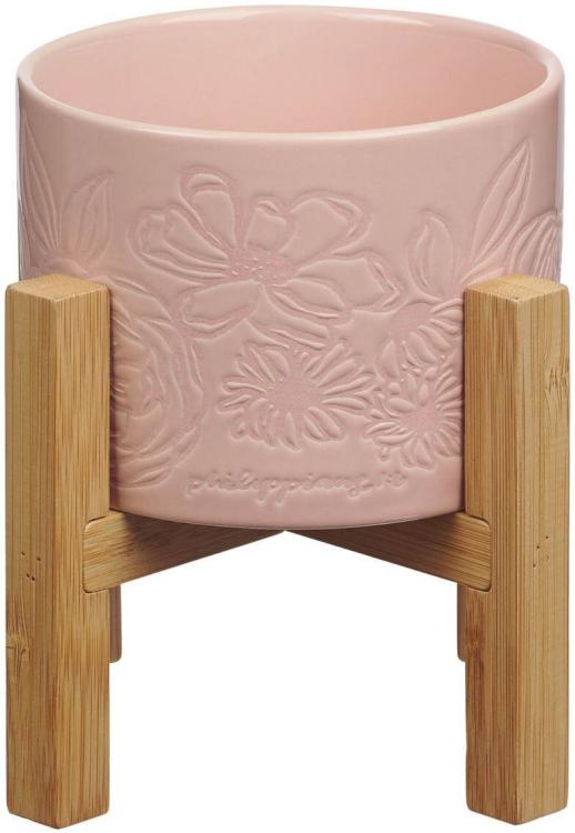 The pink ceramic planter pot features a detailed debossed floral design, with intricate flowers and leaves embossed into the ceramic. The design adds texture to the otherwise smooth ceramic pot. The planter sits securely on a minimalist bamboo stand, which elevates it off the surface. The bamboo stand has a natural wood finish with four legs that cross underneath the planter to provide stability.
