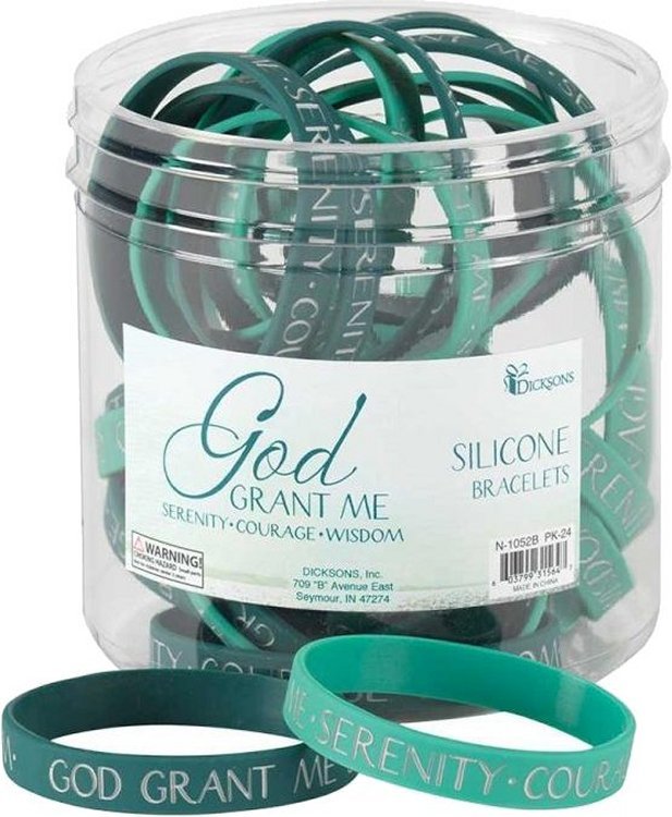 Serenity Prayer Bracelets Tub of 24 Assortment of 24 silicone bracelets in two shades of green. Each has the words, debossed in ivory, “”God grant me serenity, courage, wisdom. Bracelet is 7/16″” wide. Clear round plastic tub with lid.