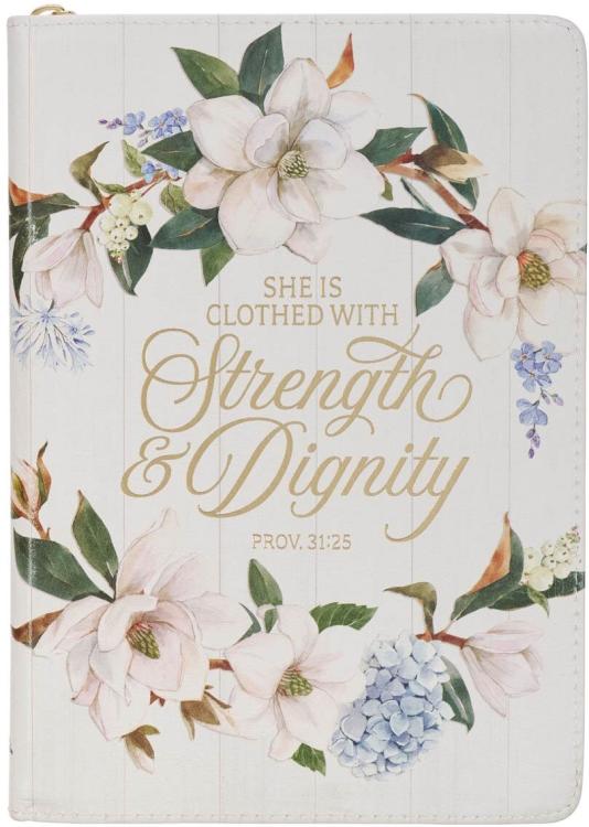 With its serene blush magnolia wreath design and handy zipper closure, the Strength and Dignity Blush Magnolia Faux Leather Journal is the perfect vessel to capture your thoughts and prayers.