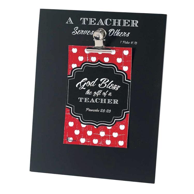 Versatile photo frame is an ideal teacher gift. Board is 8″” x 10″” and screened at top in white with “”A Teacher Serves Others 1 Peter 4:10.”” Clip holds a 4 x 6 or 5 x 7 photo; looks best with a vertical 4 x 6 or horizontal 5 x 7. Board also has a special chalkboard finish that can be written on with chalk (not included) to personalize. With the clip style frame, it’s quick and easy to change the photo displayed. Clip comes holding paper insert with “”God bless the gift of a teacher Proverbs 28:20.”” Pullout easel back for tabletop display. Board is made of MDF, a high quality wood material with smooth surface.