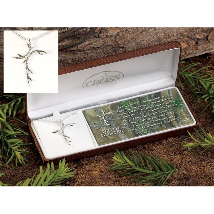 Very unique men’s cross necklace features antler design; perfect for the Christian man who loves the great outdoors! Silver plated cross is 1 1/2″” long; silver plated chain is 24″”. Handsome gift box has “”Truth Hunter”” poem on an outdoor/camouflage design background. Text of poem: Lord, I love the great outdoors, enjoying this great world of Yours, thank you for the fields and streams, because they’re every hunter’s dream. Lord, I love the Good Book too, because it brings me close to you. When I seek I always find eternal truth and peace of mind. Poem copyright Dicksons.