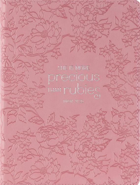 The More Precious than Rubies Strawberry Pink Handy-sized Faux Leather Journal is part of the Precious Rubies Collection, designed to celebrate the wisdom of mothers. This collection also includes a ceramic coffee mug, wirebound journal, and a coordinating gift bag.