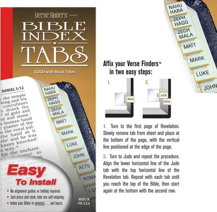 Features: Easy to install – no alignment guides or folding required. Just press and stick. Tabs are self-aligning. Index your Bible in minutes…not hours. Attractive and durable for years of trouble-free use. Horizontal style – reads left to right. Compact 3/8″ design indexes a standard Bible in only 2 rows, making books easier to find.