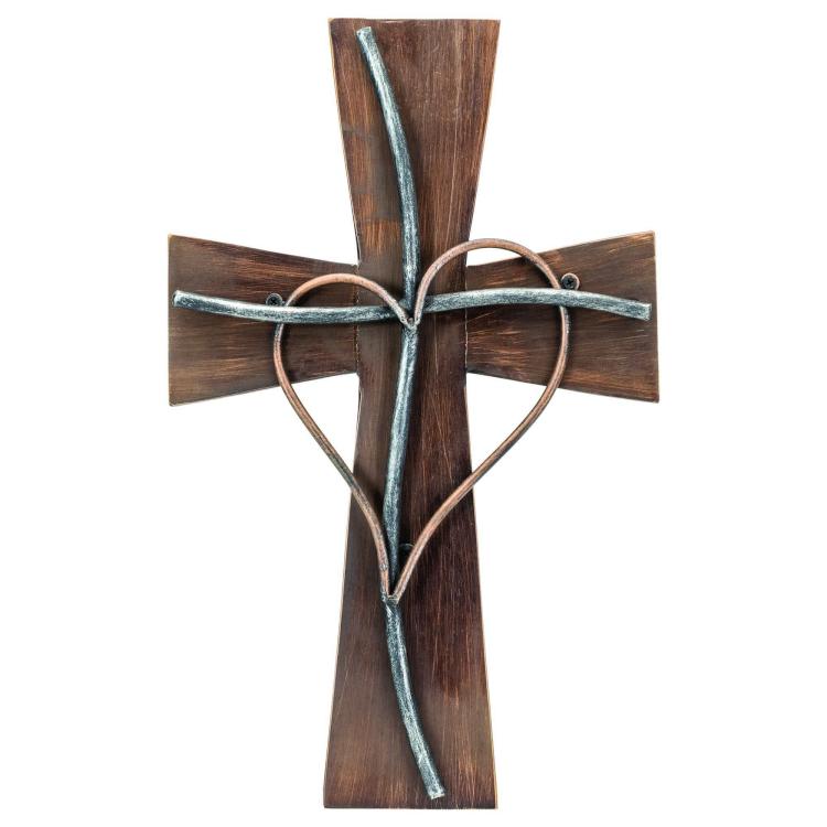 Rustic Wood Wall Cross with Silver Tone Metal Cross Copper Tone Metal Heart 18″” This heart-cross combination is unique and lovely. Solid wood cross has a rustic brown finish and is topped with metal cross in antique silver and metal heart in copper. Size of cross is 17 3/4″” high; 11 wide. Wood is 3/4″” thick. Metal hanger on back.